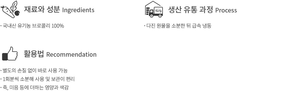 ・특징:잘게 다져낸 국내산 유기농 브로콜리를 1회분씩 소분해 한 팩당 6개씩 나눠 담았어요. 깔끔한 큐브 형태라 하나씩 꺼내 쓰기 편리합니다.