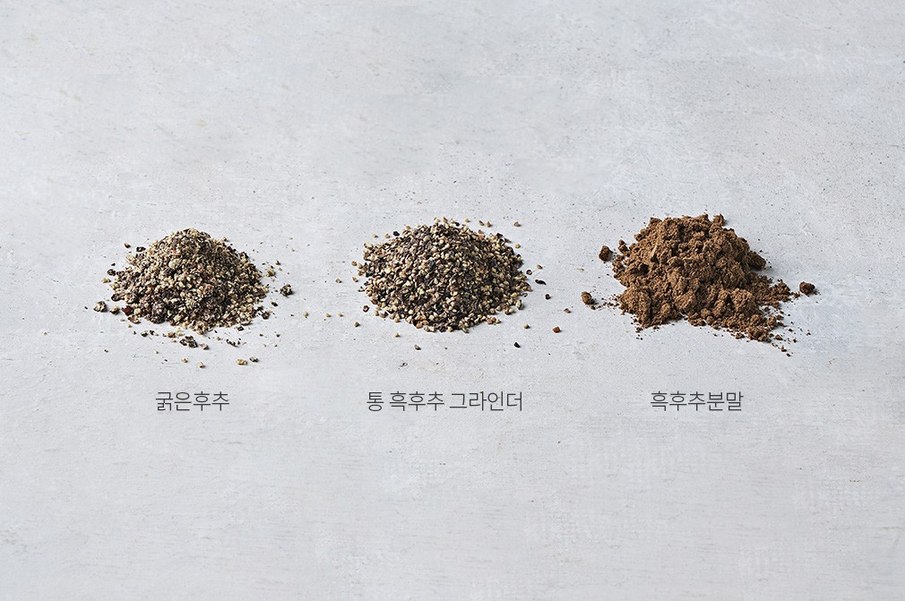 - 그라인더로 간 통후추는 불규칙한 입자에 신선하고도 강한 향을 자랑한답니다.