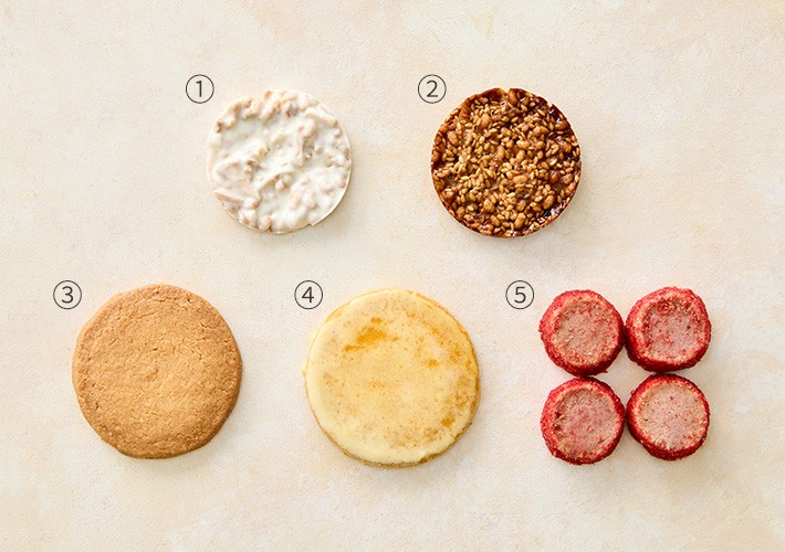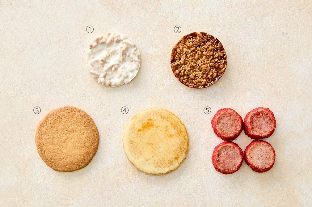 비스퀴테리 엠오 쿠키 5종 세트?구성:①크리스피 라이스펍,②누가틴 쎄자므,③사브레 브루통,④사브레 유자,⑤사브레 로즈