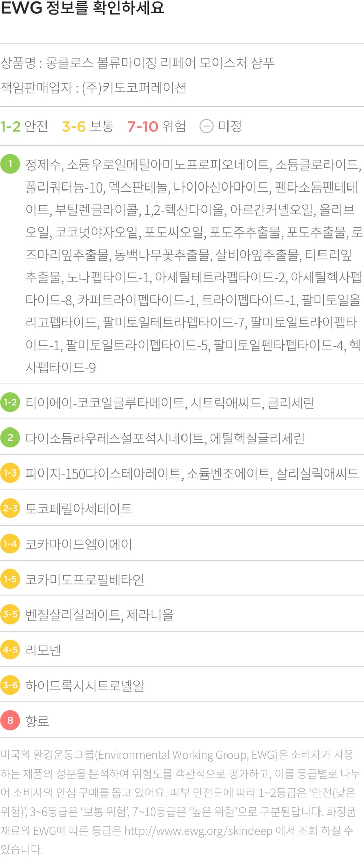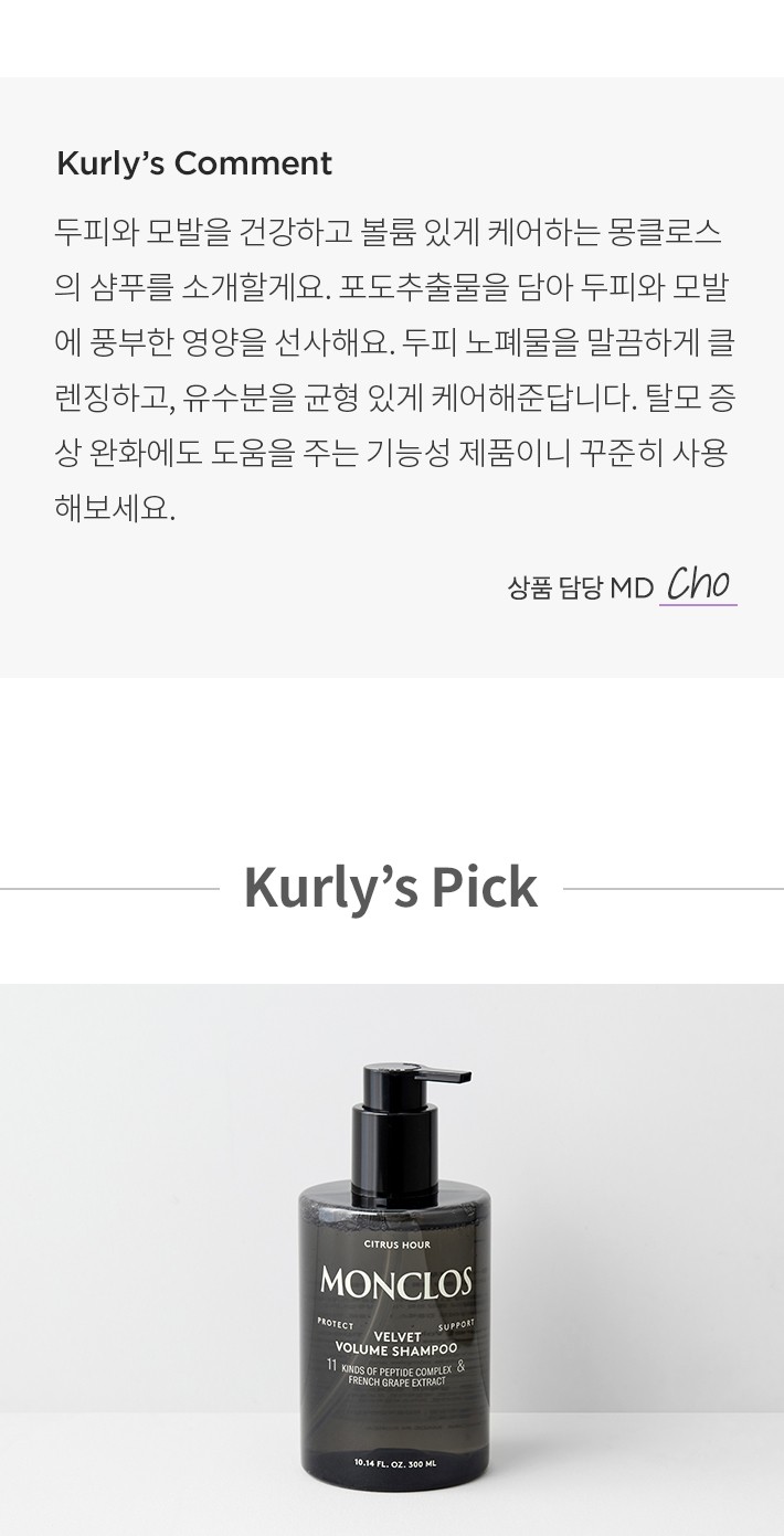・ 특징:두피와 모발을 건강하게 케어하는 볼륨 샴푸입니다. 탈모 증상 완화에 도움을 주는 기능성 제품이에요.