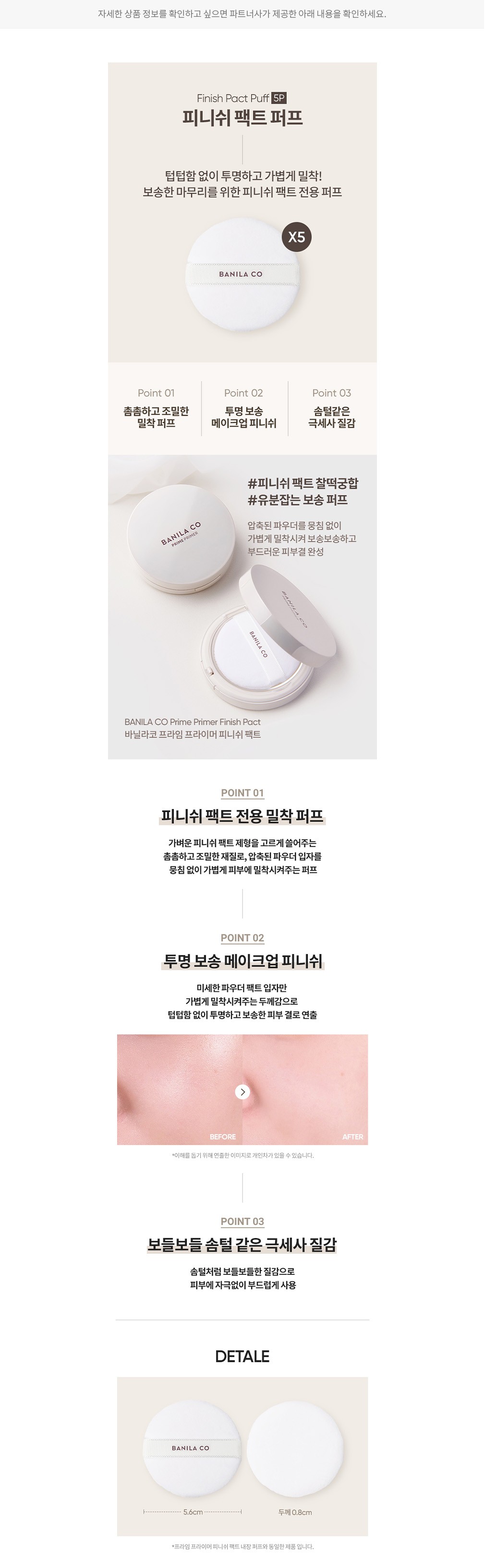 - 특징:촘촘하고 조밀한 재질의 피니쉬 팩트 전용 퍼프. 파우더 입자를 뭉침 없이 밀착시켜 투명하고 보송한 피부 연출
