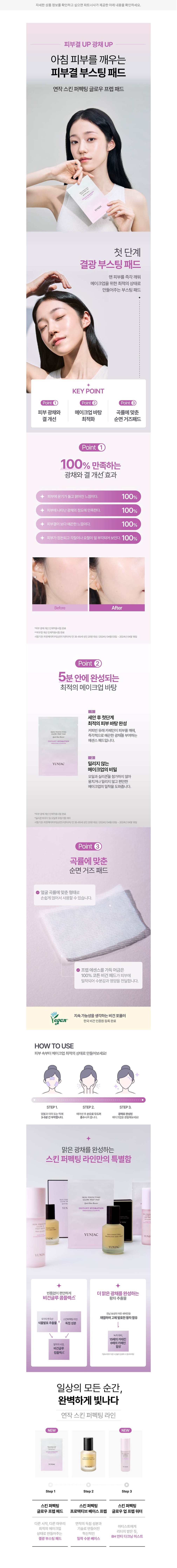 - 특징:피부에 붙여 광택감을 더하고 베이스 메이크업의 밀착력과 지속력을 높이는 에센스 패드