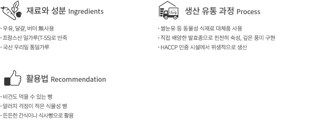 어쩔 수 없이 빵을 즐길 수 없는 분들이 계실 텐데요. 특히,계란에 알러지가 있거나 유지방을 소화시키기 어려운 분,그리고 채식을 선언한 비건 분들에게 컬리가 희소식을 가져왔어요. 컬리가 순 식물성 빵을 찾아냈거든요. 더브레드블루는 빵을 만들 때 흔히 사용하는 계란,우유,버터를 사용하지 않고 쌀눈유 등의 식물성 재료로 대체했답니다. 통밀발효종빵은 직접 배양한 발효종으로 천천히 숙성시킨 빵이라 깊은 풍미가 남다른데요. 프랑스 밀가루와 함께 우리밀 통밀가루를 활용해 고소한 맛을 자아내죠. 크랜베리,호두,아몬드와 검정깨까지 콕콕 함께 하니 밋밋하지 않고,더욱 풍성하게 즐길 수 있어요.