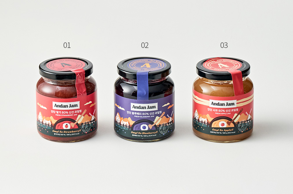 새콤달콤한 과일잼,안단잼과 함께 더욱 특별하게 즐겨 보세요. 지금 소개하는 제품은 각각 국산 딸기,사과와 미국산 블루베리를 80% 담아 자연스러운 닷맛이 느껴지는 잼이에요. 설탕의 단맛이 부담스러웠던 분들도 안심하고 즐길 수 있답니다. 빵이나 스프레드에 발라 커피나 우유와 함께 드셔보세요.