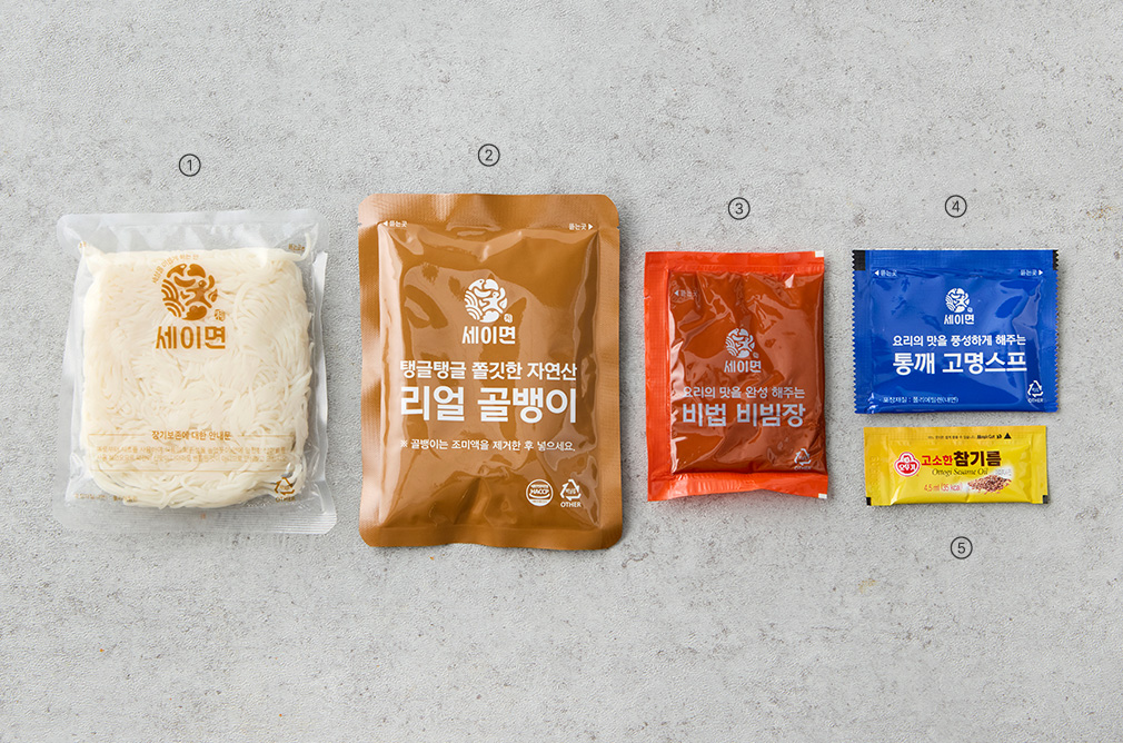 - 구성:①숙면,②골뱅이,③비법 비빔장,④통깨 고명스프,⑤참기름