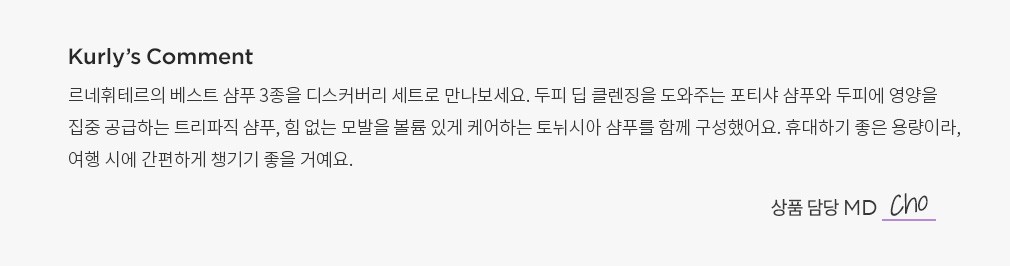 ![[르네휘테르] 트래블 디스커버리 키트 (포티샤 샴푸 50ml, 트리파직 샴푸 50ml, 토뉘시아 샴푸 50ml)](https://product-image.kurly.com/hdims/resize/%3E1010x/quality/90/src/product/image/e05ac956-0d8a-4554-9161-aa9ef5fd7de5.jpg)