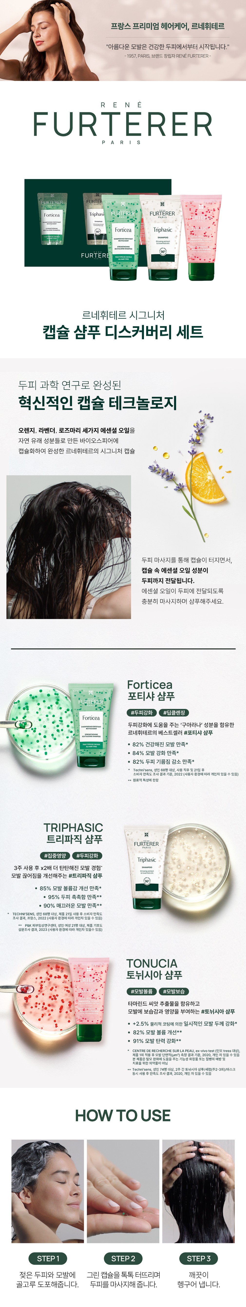 - 구성:①포티샤 두피&모발강화 샴푸,②트리파직 앰플 샴푸,③토뉘시아 플럼핑 샴푸
