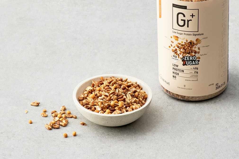 프리미엄 수제 그래놀라 브랜드,그라놀로지의 시그니처 저당 프로틴 그래놀라를 소개할게요. 스테비아와 알룰로스를 사용해 당 걱정은 덜고,프로틴 볼로 단백질을 든든하게 더한 그래놀라랍니다. 귀리,해바라기씨,아몬드 슬라이스 등 다양한 재료가 어우러져 고소한 풍미와 경쾌한 식감을 자아내죠. 요거트에 곁들여 든든한 아침으로 즐겨보세요.