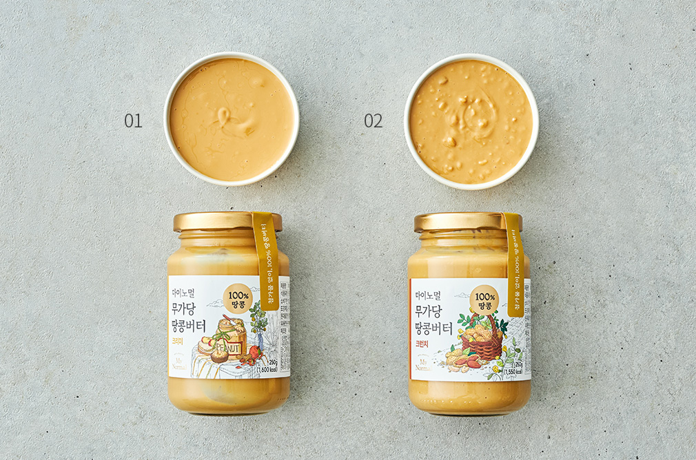 좋은 땅콩은 땅콩 자체의 고소한 맛과 단맛이 무척 매력적인데요. 마이노멀은 이러한 땅콩 본연의 매력을 그대로 즐길 수 있도록,신선한 아르헨티나산 땅콩만을 사용해 땅콩버터를 만들었어요. 다른 첨가물이나 설탕을 넣지 않아 더욱 안심이죠. 사과에 발라 먹어도 맛있고,베이킹에 활용해도 좋답니다. 크런치와 스무스 2가지 질감 중 취향대로 골라 즐겨보세요.