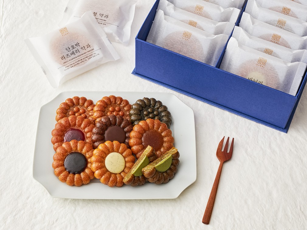 - 특징:국내산 단호박을 넣어 만든 반죽에 상큼한 라즈베리 잼을 더해 단호박 파이처럼 만든 약과