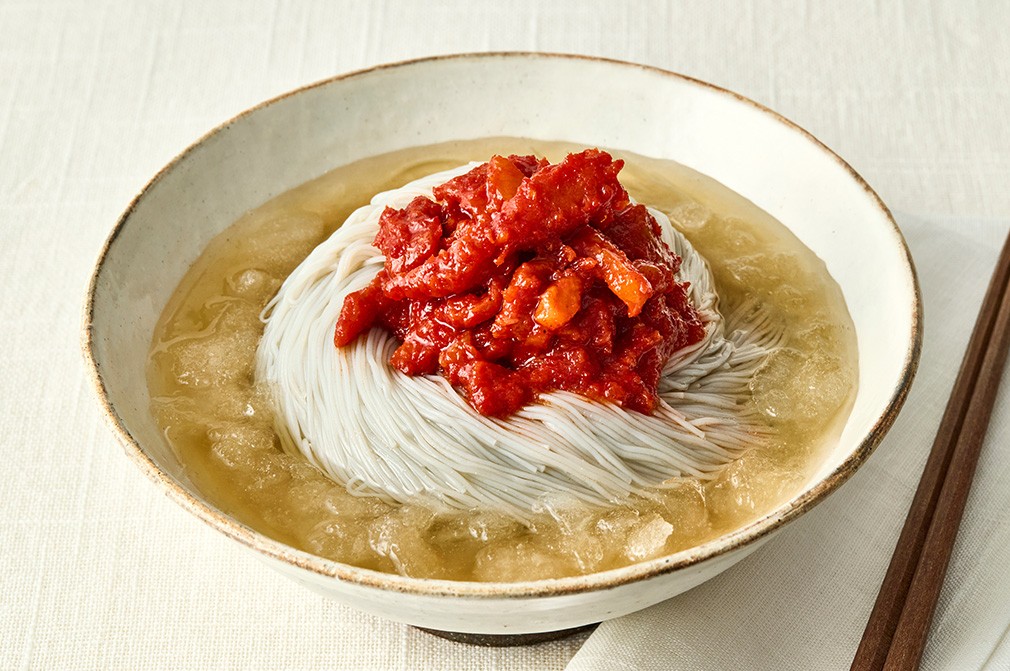 - 3.그릇에 면과 동치미육수를 담고 명태회무침을 올려주세요.