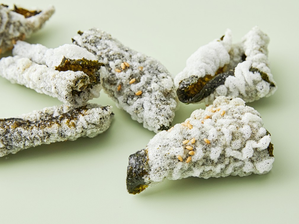 바삭바삭한 식감이 인상적이에요. 라이스 페이퍼로 눈꽃이 핀 것 같은 비주얼을 더했네요.