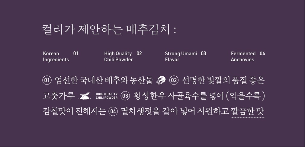 갈아 넣은 국내산 멸치 생젓은 시원하고 깔끔한 맛을 내는 역할을 해요. 고춧가루도 육안으로 보이는 색을 통해 선별했죠. 국내산 중에서도 색이 곱고 선명한 고춧가루를 사용했답니다. 보기만 해도 군침 도는 컬리스 배추김치의 선명한 색은 좋은 고춧가루를 사용했다는 증거예요.