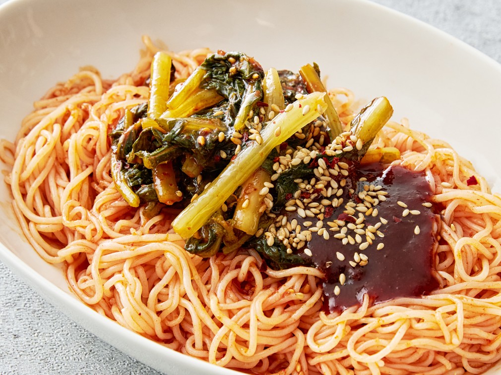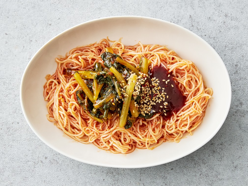 - 4.면을 그릇에 담고 열무김치와 양념장,통깨 고명과 참기름을 더해 주세요.