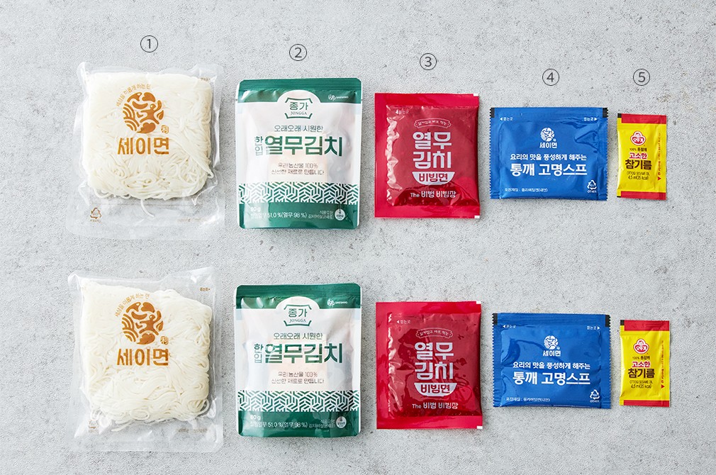 - 구성:①숙면,②열무김치,③소스,④통깨 고명,⑤참기름
