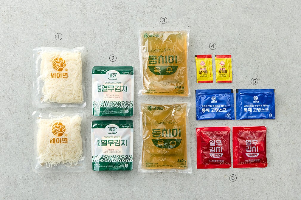 - 구성:①숙면,②열무김치,③동치미 육수,④참기름,⑤통깨 고명,⑥소스