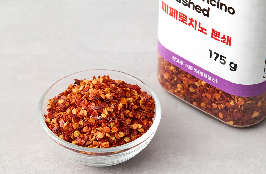 아찔한 매운맛을 가진 페페로치노를 거칠게 빻아 준비했어요. 이탈리아 요리에 주로 사용되는 페페로치노는 잘게 부숴 사용하면 매운맛이 더욱 강하게 우러나는데요. 바로 사용할 수 있도록 미리 분쇄해 두어서 간편하답니다. 오일 파스타,볶음밥,쌀국수 등 다양한 요리에 살짝 뿌려주면 매콤한 풍미를 더해 줄 거예요.