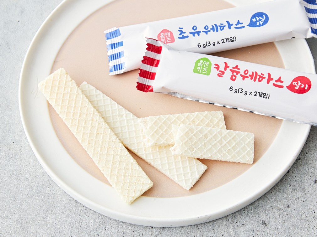 밀크 칼슘,초유 단백 분말을 더해 완성한 홈앤키즈의 웨하스 2종을 소개할게요. 얇은 웨이퍼 사이에 달콤한 크림을 발라 완성했답니다. 하나씩 개별 포장되어 있어 깔끔하게 즐길 수 있는 것은 물론,아이들이 한 손에 쥐고 먹기에도 좋아요. 2가지 종류를 준비했으니 아이들의 취향에 맞게 선택해 보세요.