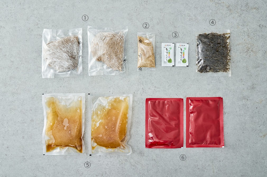 - 구성:①도토리 메밀면,②깻가루,③들기름,④김 가루,⑤육수,⑥비빔 소스