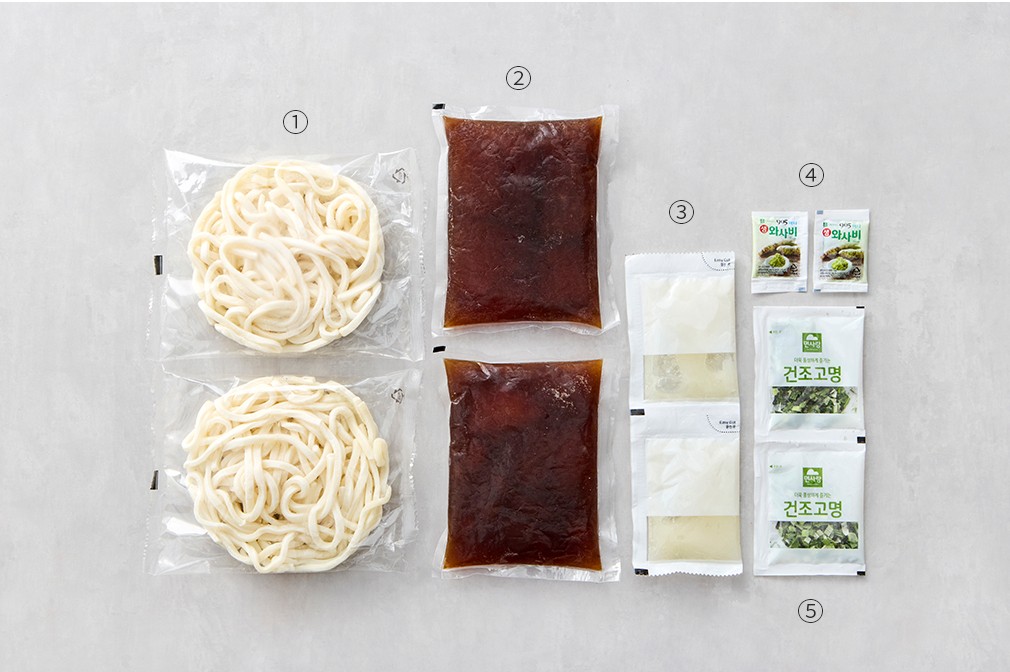 - 구성:①우동면,②가쓰오 장국,③간무,④와사비,⑤건조 고명