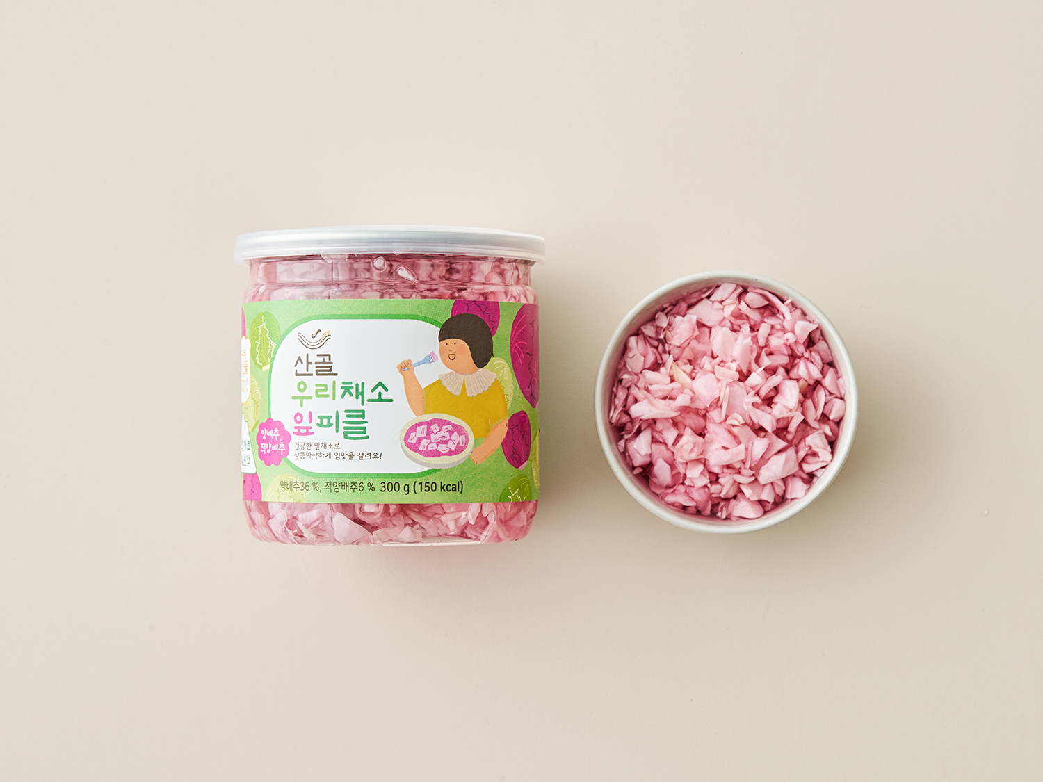 - 특징:국산 양배추,적양배추의 아삭한 식감과 은은하고 화사한 색감이 어우러진 새콤달콤한 잎피클