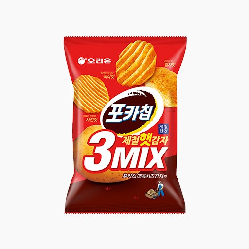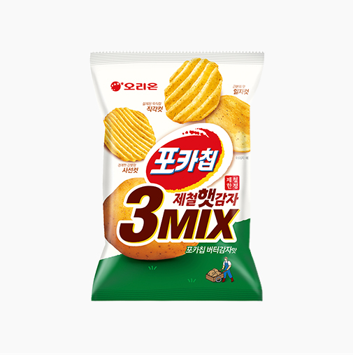 - 특징:국내산 감자를 얇게 썬 후 매콤하고 짭짤한 치즈 시즈닝을 뿌린 포카칩,세 가지 모양의 감자칩을 한 봉지에 담은 구성