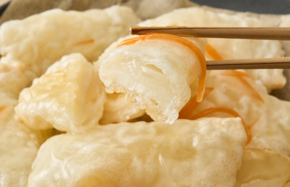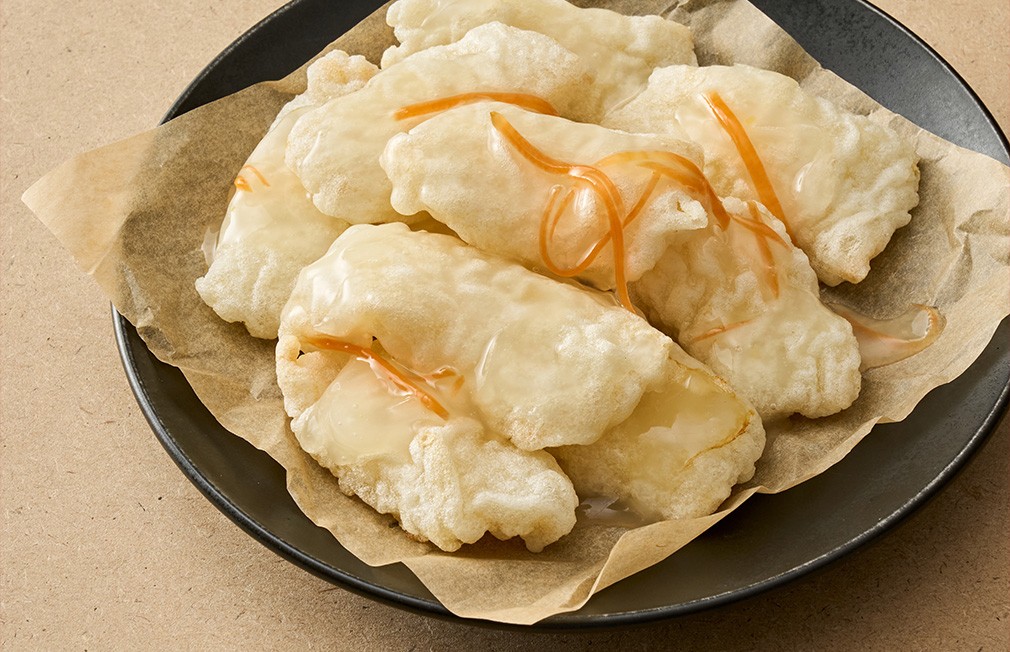 Point 2. 꿔바로우처럼 쫀득하고 바삭한 식감을 느낄 수 있도록 튀김옷 반죽에 찹쌀을 더했어요. 집에서도 매장의 튀김처럼 뽀얗게 튀겨낼 수 있도록 눈꽃 파우더도 함께 반죽해 튀겨냈답니다.