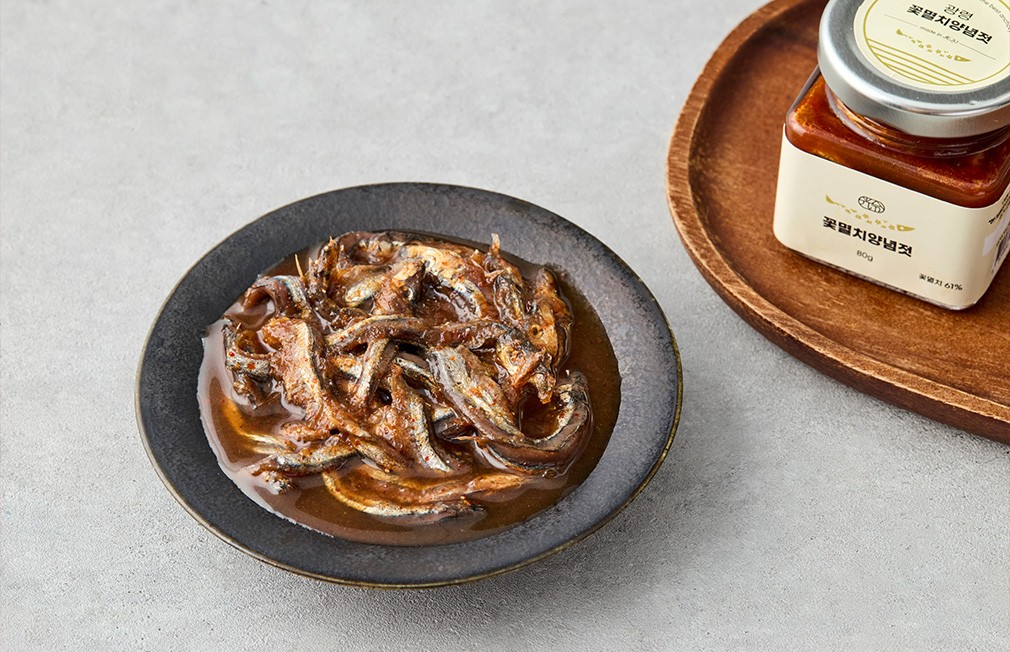 일반 대멸치가 아닌 제주산 꽃멸치만 선별해서 만들었어요. 제주 비양도에서 소량만 어획되는 ‘샛줄멸’이라 불리는 희소한 어종이지요. 숙성하면 탄탄하고 쫄깃한 식감을 느낄 수 있어 꽃멸치 젓갈은 ‘육(肉)젓’이라 불리기도 한답니다.