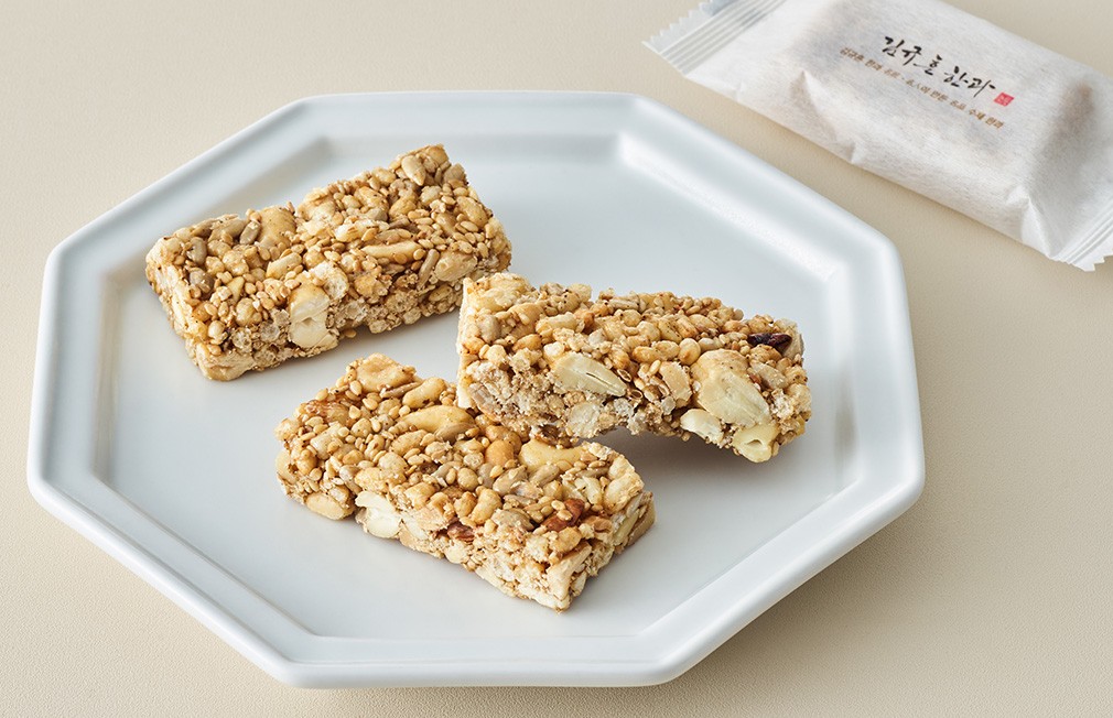 딱딱한 강정이 부담스러우셨다면,김규흔 한과의 참깨방정을 추천드려요. 기름에 튀기지 않고 볶아 식감이 한결 부드러워요. 참깨와 캐슈넛,해바라기씨,호두,땅콩 다섯 가지 견과를 더해 고소한 맛이 물씬 느껴진답니다. 낱개 포장돼 있으니 입이 심심할 때 하나씩 꺼내 드셔보세요.