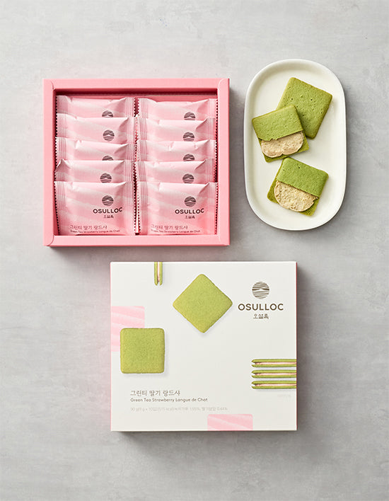 향긋한 녹차 쿠키 사이에 상큼한 딸기 크림이 들어간 오설록 그린티 딸기 랑그샤예요. 바삭하면서도 부드럽게 씹히는 쿠키에선 버터 풍미가 물씬 풍겨 더욱 고급스럽습니다. 깔끔한 패키지에 한 개씩 낱개 포장되어 선물용으로도 좋아요.