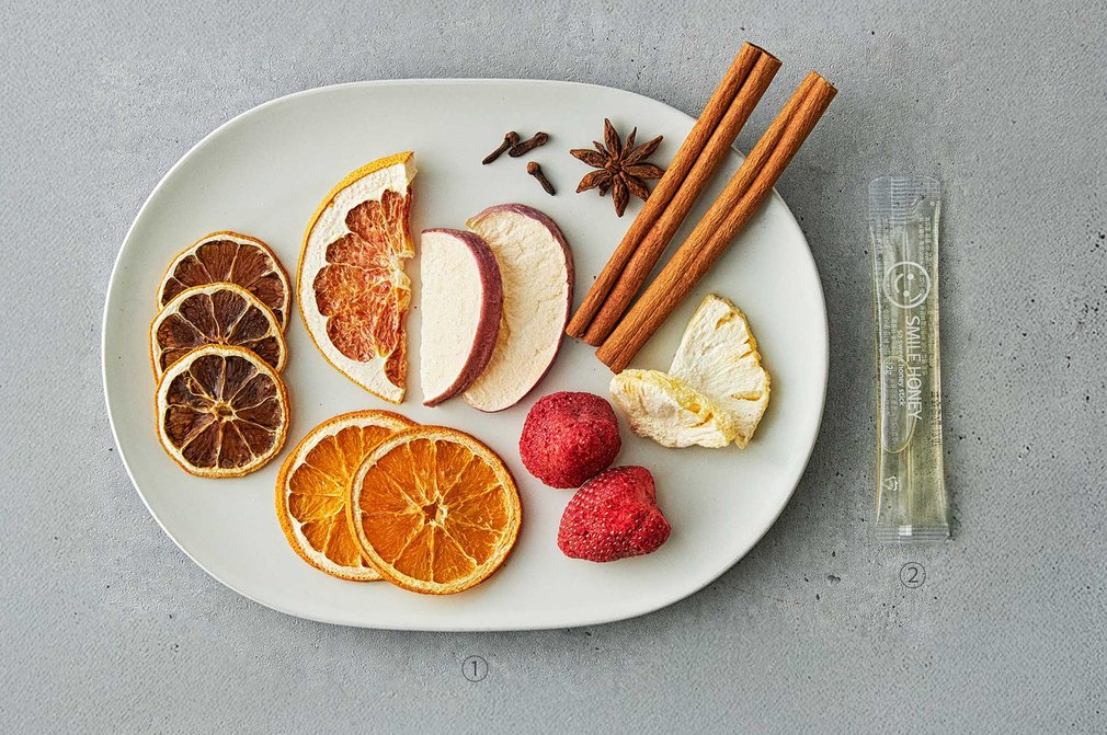 - 구성: ①건과일과 향신료(오렌지,딸기,자몽,팔각향,정향 등),②벌꿀 스틱