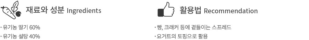 유개농 재료로 만들어 더욱 안심하고 즐길 수 있는 네니아의 유기농 딸기잼을 만나보세요. 싱싱한 국산 유기농 딸기만을 골라 깨끗하게 세척한 뒤,유기농 설탕을 넣어 완성했답니다. 덕분에 딸기 고유의 자연스러운 단맛과 상큼함이 그대로 살아있지요. 빵이나 크래커에 곁들이는 스프레드는 물론,요거트의 토핑으로 활용해도 매력만점일 거예요. 온 가족이 즐기는 딸기잼으로 고민 없이 선택해보세요.