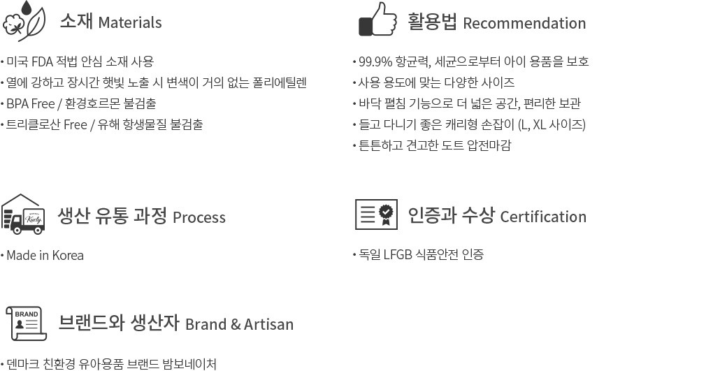 아이를 데리고 외출할 때면 간식,생활용품,장난감,옷까지 챙겨야 할 물건이 한두 가지가 아니죠. 덴마크 친환경 유아용품 브랜드인 밤보네이처의 향균 지퍼백에 깔끔하게 나눠 담아보세요. 외부 유해균으로부터 소중한 우리 아이 용품과 먹거리를 안전하게 지켜주고,5가지의 다양한 사이즈로 작은 용량의 간식부터 부피가 큰 옷까지 용도별로 골라서 사용할 수 있어 실용적이에요. FDA 승인을 받은 소재로 음식을 넣어도 안심이니까 이제부터 외출할 때는 잊지 말고 항균 지퍼백을 챙겨주세요.