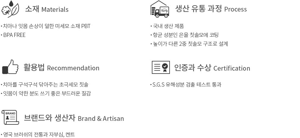 ・특징:0.01mm의 초극세모가 치아 사이의 좁은 틈새까지 닦아주는 칫솔이에요. 초극세모가 잇몸 라인에 맞게 곡면 형태로 디자인되어 있습니다.