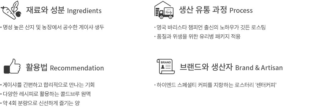 ・활용팁:산뜻한 향의 진과 화려한 풍미를 지닌 게이샤 콜드브루를 섞어 게이샤 진토닉으로 만들어보세요. 가까운 사람들과 함께하는 홈 파티 등에서 즐거움을 더해줄 거예요.