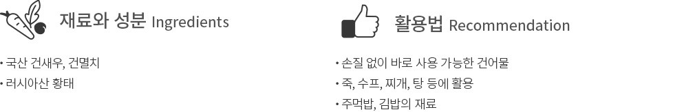 ?특징:깨끗하게 잘 말린 국산 건새우를 지퍼백에 포장했어요. 아이 식단에 영양 뿐만 아니라 특유의 고소한 감칠맛까지 더해줍니다.