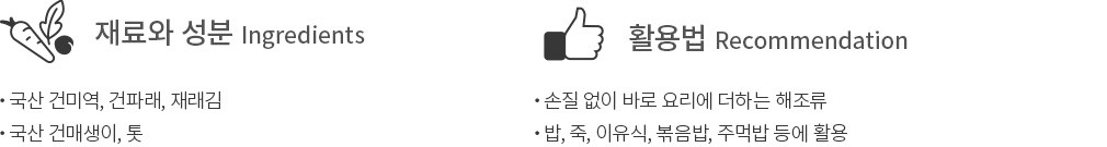 ?특징:국산 미역을 한 입 크기로 자르고 건조해 한 팩에 포장했어요. 한 봉지로 약 4~5인분의 미역국을 만들 수 있습니다.