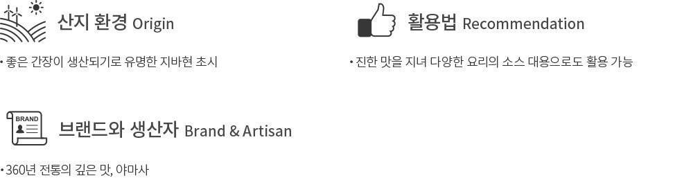 다양하게 즐기는 사시미 간장 이렇게 생산된 야마사의 사시미 간장은 달콤하고도 새콤하고,짭짤하면서도 은은하게 씁쓸한 맛이 나요. 여기에 흔히 감칠맛이라고도 불리는 '우마미(うまみ)'를 지녀 사시미에 곁들이기에는 더할 나위 없이 좋은 간장입니다. 뛰어난 향기와 맛 사이의 적절한 균형은 사시미의 자연스러운 맛을 이끌어내지요. 진하지만 어느 한 부분이 튀지 않는 간장이기에 일식 요리에 다양하게 곁들이기도 좋아요. 기호에 따라 사시미 간장에 미림과 정종을 첨가하시면 더 향긋하게 즐기실 수 있답니다.