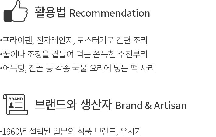 입에 찰싹 달라붙을 정도로 쫀득쫀득한 찹쌀떡은 언제 먹어도 참 맛있어죠. 이번에는 집에 챙겨 두면서 요긴하게 꺼내 먹기 좋은 기리모찌를 준비했어요. 하나씩 개별로 포장되어 있어 원하는 만큼 사용하기 좋아요. 프라이팬에 노릇하게 구워내면 부드럽게 부푼 떡을,각종 국물 요리에 넣어 끓이면 주욱 늘어나는 쫄깃한 떡을 즐길 수 있죠. 가래떡을 즐기듯 꿀이나 조청을 곁들여도 좋고,김에 싸서 드셔도 아주 잘 어울린답니다.