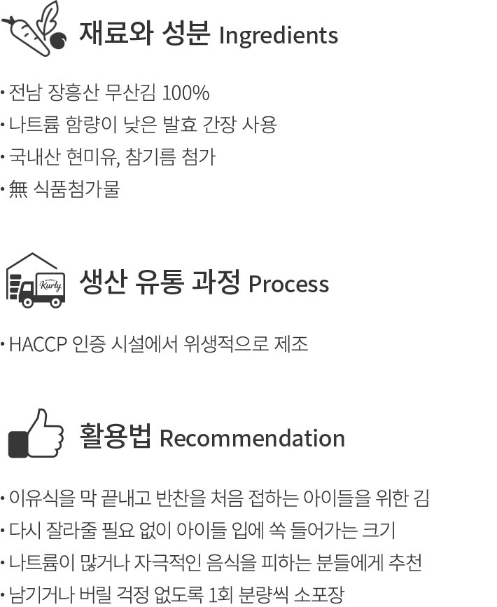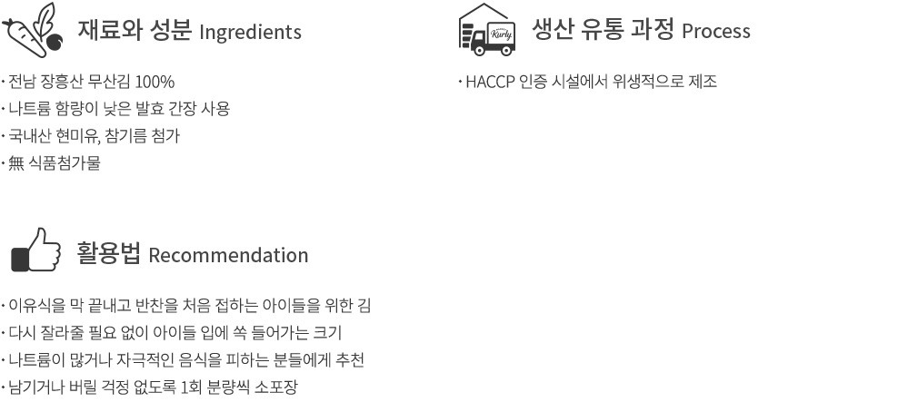 ・특징:산 처리제를 사용하지 않고 햇빛과 해풍으로 말린 무산김에 발효 간장을 넣어 맛을 낸 어린이용 김입니다. 이유식을 막 끝내고 반찬을 처음 접하는 아이들에게 주기 좋아요.