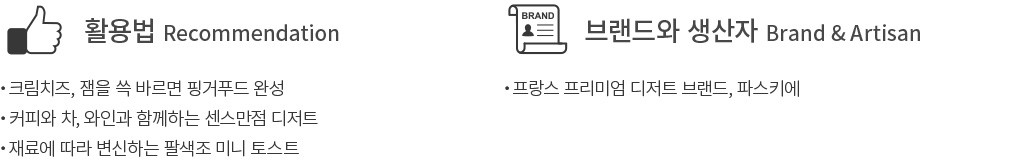 어디든 잘 어울리는 만능 미니 토스트. 컬리는 파스키에 미니 토스트에 '팔색조'라는 별명을 붙여 줬어요. 누가 어떻게,어떤 재료와 곁들이느냐에 따라 맛과 모습이 가지각색으로 변하기 때문이죠. 생각한 대로 상상한 대로 펼쳐지는 이색 디저트를 소중한 지인을 초대하는 홈 파티에서,오붓하게 즐기는 와인 테이블에서 즐겁게 내놓아보세요.