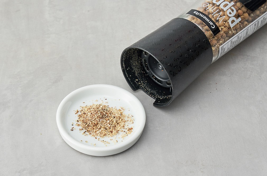 - 카르멘시타의 그라인더에는 굵기를 두 가지로 조절하는 기능이 있습니다. 그라인더 앞쪽을 살짝 빼서 사용하면 후추가 굵게 분쇄되고,있는 그대로 사용하면 입자가 고운 후추가 나오죠. 필요에 따라 굵기를 조절하여 신선한 후추의 풍미를 제대로 느껴보세요.