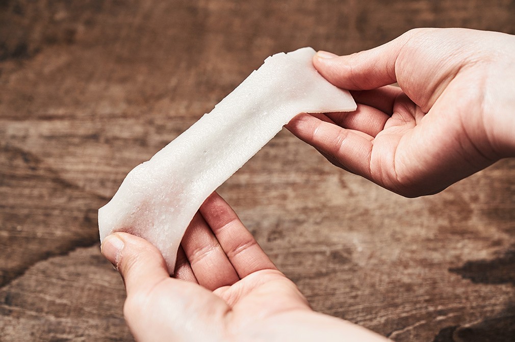 일본 니가타에서 온 모찌 우사기 모찌가 탄생한 곳은 소설 '설국'의 배경지로 유명한 니가타현이에요. 수북하게 쌓였던 눈이 녹으면서 청정한 지하수가 되는데요. 니가타의 맑은 물 덕분에 이곳에선 품질 좋은 곡식이 많이 생산되고 있어요. 그 대표적인 곡식이 바로 명품 쌀로 칭송받는 '고시히카리'입니다. 고시히카리의 명성에는 다소 못 미치지만 니가타에서 재배되는 찹쌀의 품질 또한 뛰어나지요. 이번에 소개하는 우사기 모찌는 모두 니가타 현지의 농가에서 생산된 찹쌀로 만들어졌어요. 다양한 모찌를 개발해온 우사기는 품질 좋은 찹쌀만을 선별하여 증기로 찐 뒤 치대어 탱탱하고 거대한 흰 반죽을 탄생시킵니다. 이 반죽을 넓고 얇게 핀 뒤,먹기 좋게 잘라 완성한 것이 샤브샤브 모찌랍니다.