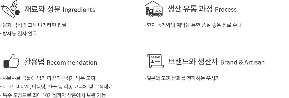 일본에서는 우리가 상상하지 못했던 독특한 모찌를 개발해 즐겨 먹지요. 컬리는 샤브샤브에 특화된 우사기 샤브샤브용 모찌를 준비했어요. 0.3mm의 초 슬림한 떡은 5초만 담가도 말랑말랑해져,찰지고 윤기 나는 모찌를 즐길 수 있어요. 어떤 식품 첨가물도 사용하지 않아 찹쌀 자체의 맛과 쫄깃쫄깃한 식감이 그대로 느껴집니다. 공기와의 접촉을 차단하는 특수 포장재를 사용해 장기 보관할 수 있다고 해요. 샤브샤브용으로 나왔지만,오코노미야끼,각종 전골 및 나베 요리에 사용이 가능하답니다.