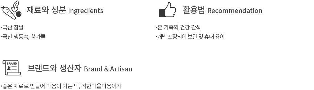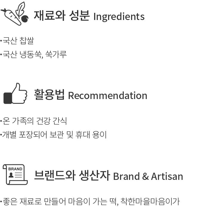 성남 판교에 위치한 착한마을마음이가는 좋은 재료로 만들어야 한다는 신념으로 떡을 만들고 있는 떡 전문업체예요. 소비자들이 믿고 먹을 수 있는 떡을 만들기 위해 도정한지 1달 이내의 국내산 찹쌀과 엄선한 좋은 재료만을 사용합니다. 이러한 노력으로 현재 국내 유명 백화점에 입점한 것은 물론,미국,유럽 등에 수출되고 있어요. 또한,기존에는 없었던 새로운 맛의 떡을 개발하기 위해 맛을 끊임없이 연구합니다.