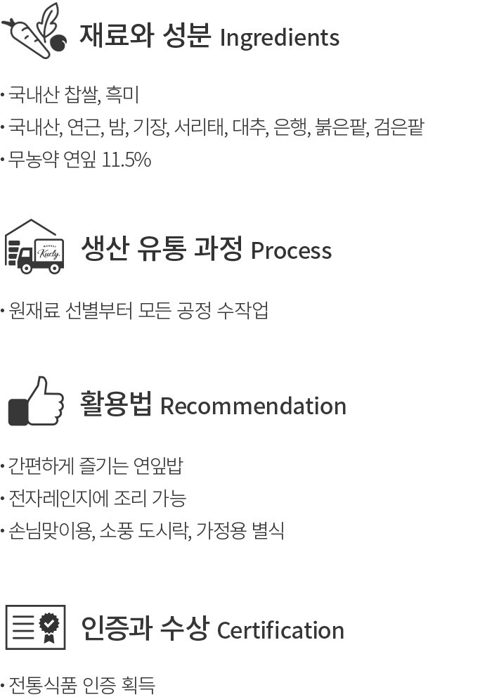 갖가지 재료 뿐 아니라 만든 이의 정성까지 듬뿍 담긴 연잎밥이에요. 보통 정성이 들어간 게 아니죠. 국내산으로 이루어진 재료의 선별부터 재료 손질,뜸 들이기,연잎 속에 단정히 담아내기 등 한 단계 한 단계를 소홀히 하지 않았죠. 이 탐스러운 연잎밥을 이젠,가정에서 간편히 즐겨보세요. 밥솥에서 10분 내외로 쪄내기만 하면 금세 완성돼요. 은은하게 베인 연잎의 내음과 연구 끝에 완성된 구수한 밥맛. 상 위에 툭 놓아만 둬도 고급스러운 한 상이 차려진답니다. 손님 맞이용 별식으로,피크닉용 도시락 메뉴로도 손색이 없어요.