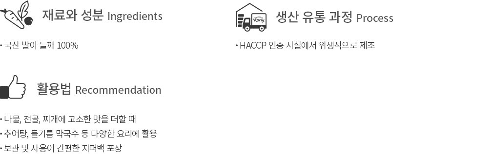 들깨가루는 특유의 향으로 요리할 때 한 스푼만 넣어도 음식의 풍미를 확 끌어올려 주는 유용한 식재료예요. 지금 소개하는 청오 국내산 발아 들깨가루는 국산 발아 들깨 외에는 그 무엇도 첨가하지 않은 제품이에요. 국산 들깨를 발아시킨 후 정성껏 볶아 영양은 물론 그윽한 향기까지 오롯이 담았는데요. 발아 과정 중 혹시 걸러지지 않은 불순물을 제거하기 위해 여러 번 세척해 안심하고 먹을 수 있답니다. 지퍼백에 담겨 있어 원하는 만큼 깔끔하게 사용하기에도 참 좋을 거예요.