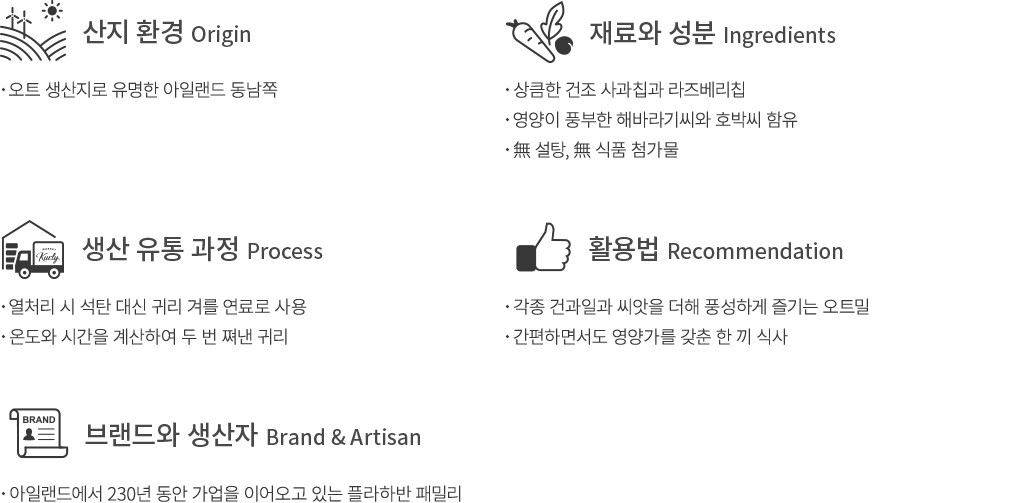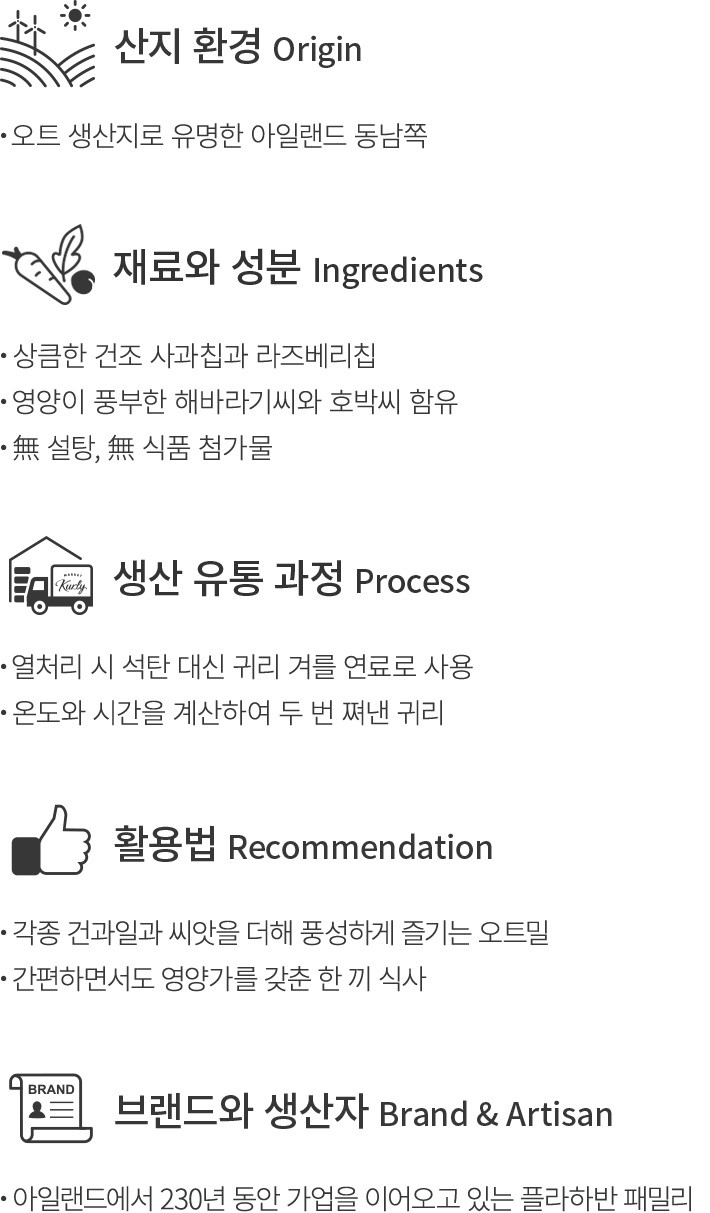 ・원재료 :통곡물 압착귀리 83.4%,씨앗 10% (해바라기씨,호박씨),건조과일 6.6% (사과,동결건조 라즈베리)