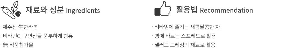・테이스팅 노트 :한라봉 특유의 향기가 은은하게 나요. 과육을 씹으면 감귤류의 과일이 주는 새콤달콤함이 배어나옵니다. 레몬청의 상큼함은 유지하되,조금 더 달게 먹고 싶다면 한라봉청을 권해드릴게요.