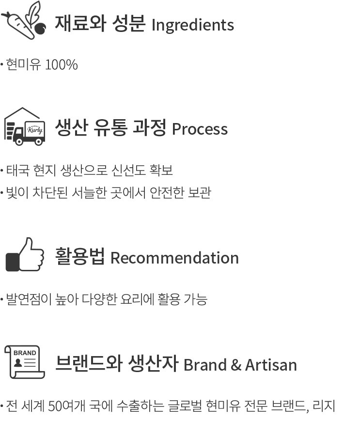 미강유라고도 불리는 현미유는 쌀겨를 압착하거나 추출해 만드는 기름입니다. 기름 특유의 느끼함이 거의 없고 순하고 가벼운 풍미를 지녀,요리를 했을 때에도 맛이 깔끔하게 떨어지죠. 지금 소개하는 현미유는 100년의 역사를 가진 태국의 현미유 전문 브랜드,리지의 제품인데요. 오직 100% 현미유만을 담아 더욱 깔끔하답니다. 발연점이 높은 편이니 튀김,볶음,구이 요리 등에 다양하게 활용해 보세요. 샐러드 위에 살짝 뿌려내는 깨끗한 맛의 드레싱으로도 제격일 거예요.